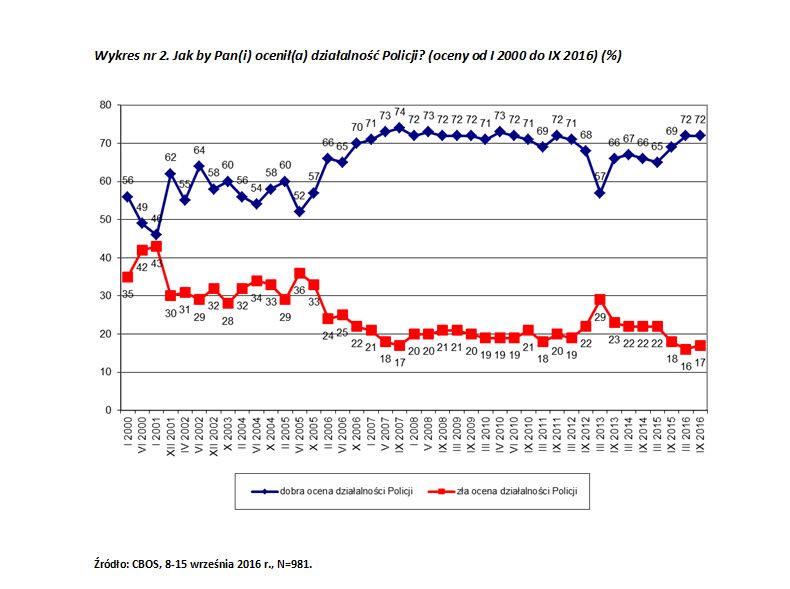 CBOS, w badaniu cyklicznym, monitoruje opinie dorosłych Polaków na temat działalności parlamentu i prezydenta, natomiast dwa razy w roku ocenie poddaje większą liczbę instytucji publicznych. W ostatniej edycji badania, przeprowadzonej w dniach 8-15 września 2016 roku, respondentów poproszono m.in. o ocenę działalności Policji.
