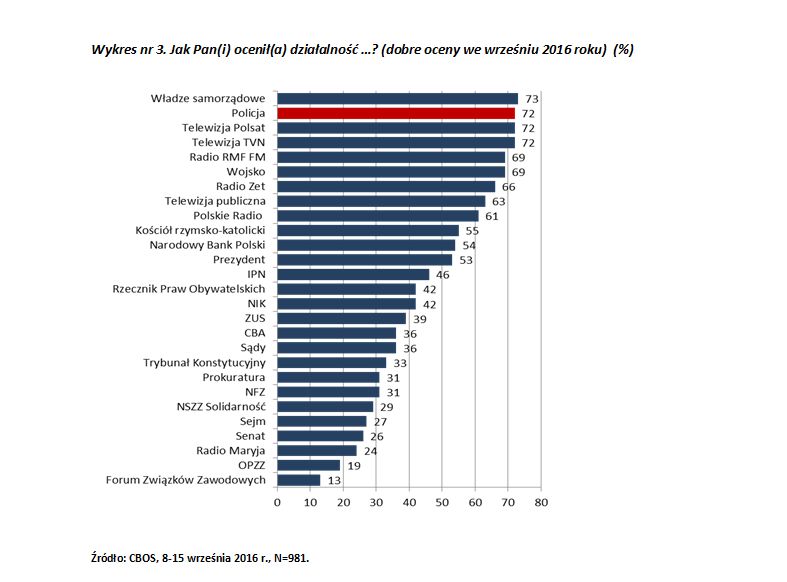 Większość Polaków (72%) dobrze ocenia działalność policji. Z badania dotyczącego oceny instytucji publicznych, zrealizowanego przez Centrum Badania Opinii Społecznej w dniach 8-15 września 2016 roku wynika, że policja jest najwyżej ocenianą służbą mundurową.