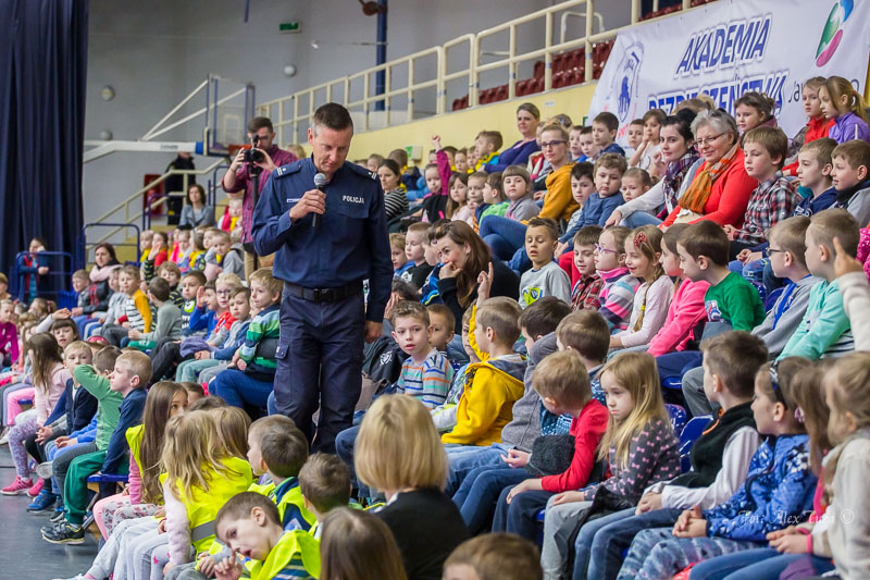 W poniedziałek i wtorek przedszkolaki odwiedziły halę sportową w centrum miasta, aby od przedstawicieli różnych instytucji, dowiedzieć się jakie są zasady zachowania na drodze, w autobusie, na ulicy lub w parku. Co należy robić, kiedy widzimy osobę poszkodowaną, gdzie zatelefonować, jak zatamować krew, a jak zabezpieczyć złamaną rękę. Dzieci powitał Zastępca Naczelnika Wydziału Prewencji podinsp. Jacek Sowa, który zadał najmłodszym kilka pytań.