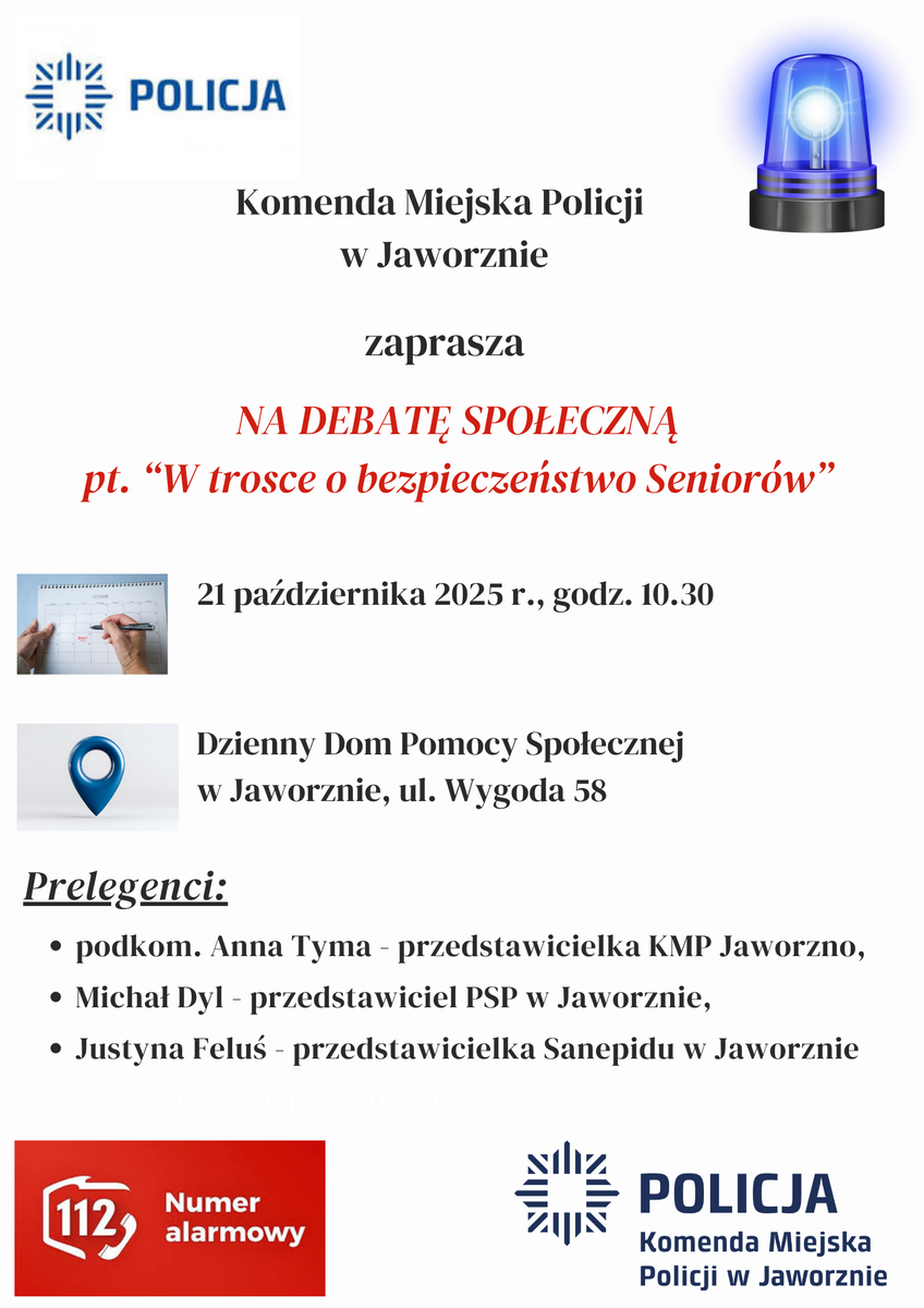 Komenda Miejska Policji w Jaworznie organizuję debatę społeczną pt. "W trosce o bezpieczeństwo Seniorów". Spotkanie odbędzie się 21 października 2025 roku o godzinie 10.30 w Dziennym Domu Pomocy Społecznej w Jaworznie przy ul. Wygoda 58. Serdecznie zapraszamy Seniorów oraz wszystkich zainteresowanych.