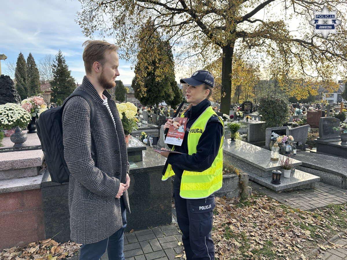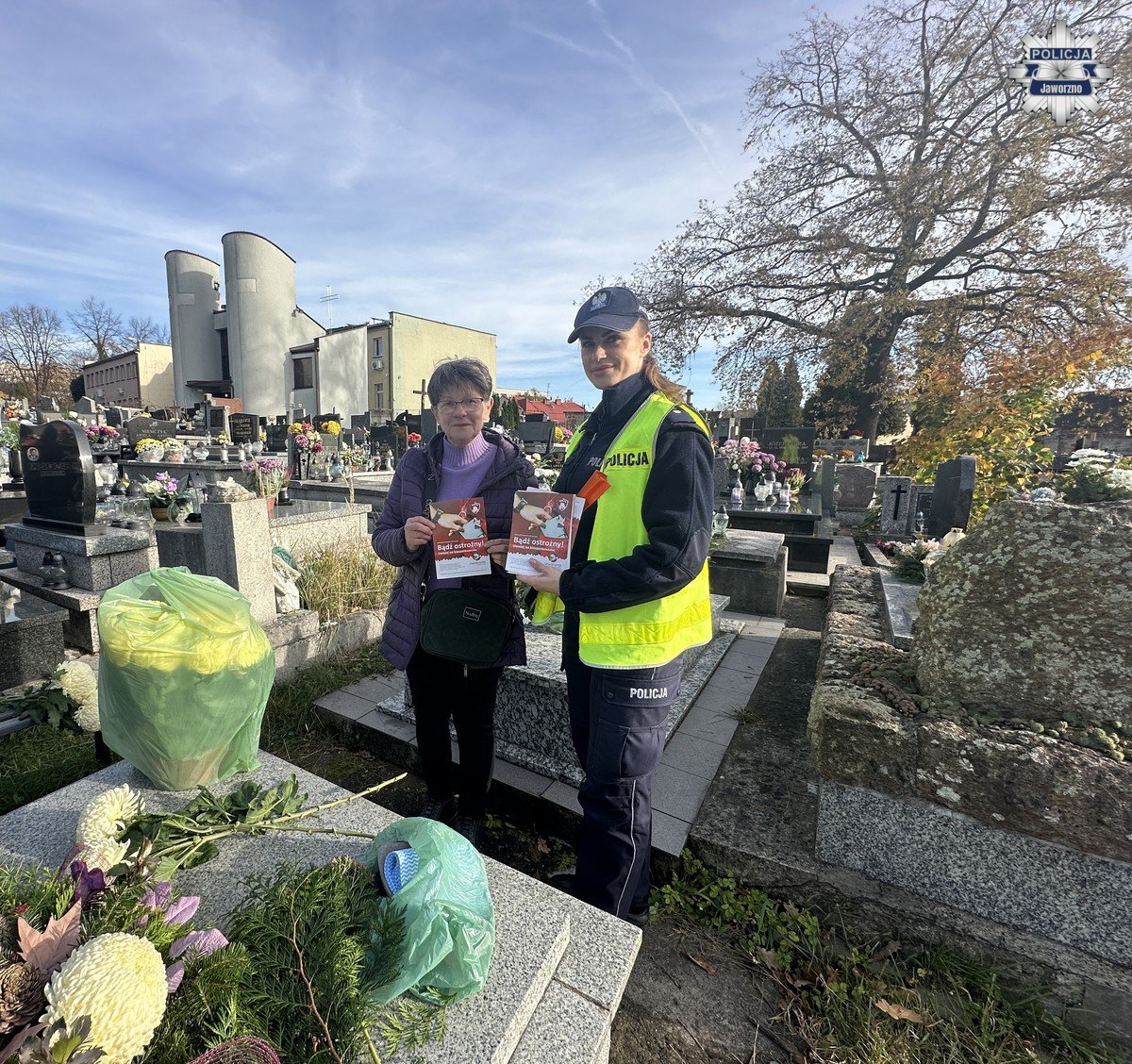 W ramach działań związanych z okresem Wszystkich Świętych policjanci z Komendy Miejskiej Policji w Jaworznie prowadzą wzmożone działania profilaktyczne na terenie cmentarzy i w ich okolicach. Mundurowi rozmawiają z mieszkańcami o bezpieczeństwie, przypominają o zachowaniu ostrożności oraz rozdają elementy odblaskowe w ramach kampanii „Bądź widoczny - noś odblaski”.