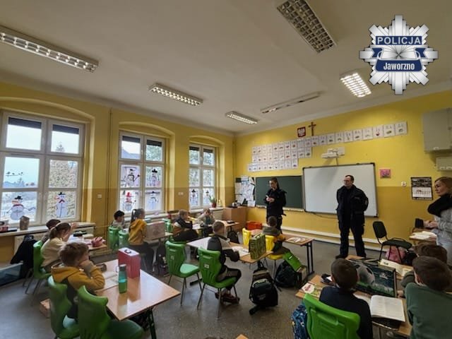 Policjantka z Zespołu d/s Patologii, Profilaktyki i Nieletnich Komendy Miejskiej Policji w Jaworznie wspólnie z dzielnicowym przeprowadzili spotkanie profilaktyczne z uczniami. Prelekcja odbyła się w Szkole Podstawowej nr 21 w Jaworznie w ramach zbliżającej się akcji „Bezpieczne Ferie 2026”. Mundurowi rozmawiali z dziećmi o zasadach bezpieczeństwa podczas zimowego wypoczynku.