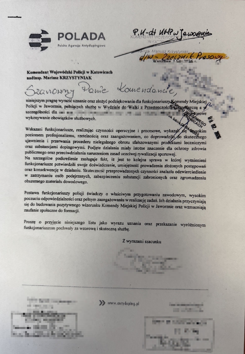 Polska Agencja Antydopingowa skierowała podziękowania dla policjantów Komendy Miejskiej Policji w Jaworznie za profesjonalne i skuteczne działania w sprawie dotyczącej nielegalnego obrotu sfałszowanymi produktami leczniczymi oraz substancjami dopingowymi. Doceniono zaangażowanie, rzetelność oraz wysoki poziom prowadzonych czynności operacyjnych i procesowych. Skuteczna realizacja sprawy przyczyniła się do ochrony zdrowia publicznego oraz przeciwdziałania naruszeniom zasad uczciwej rywalizacji sportowej.